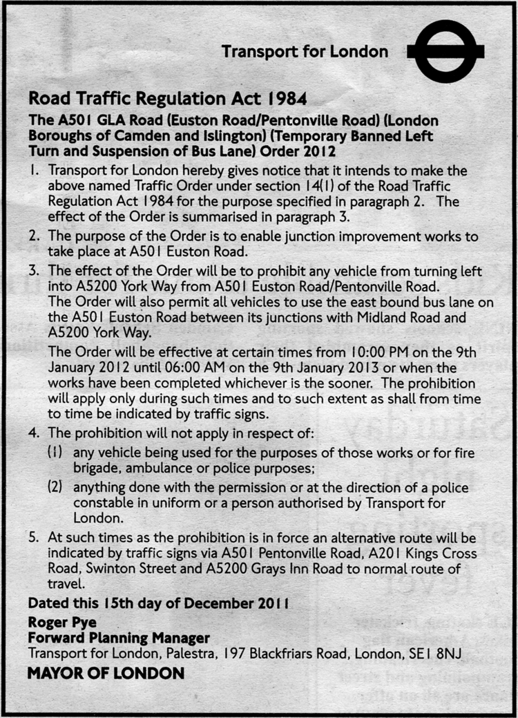 From 9 January 2012 to 9 January 2013 the left turn at the junction of Euston Road/Pentonville Road into York Way will be suspended at certain times of the day whilst Transport for London (TfL) undertakes limited improvements.