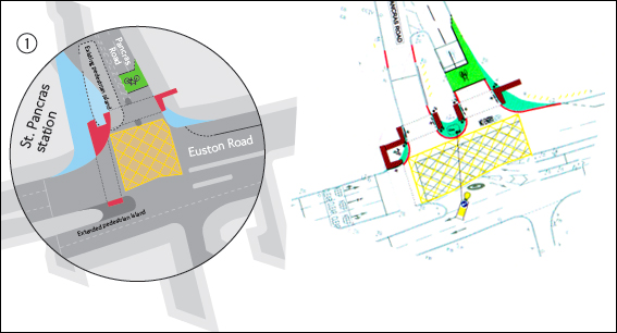 In summary the works are: to create a straight-across crossing at the junction of Pancras Road and Euston Road, an advanced stop line (ASL) for cyclists, widening of pedestrian crossing on the Caledonian/Pentonville Road junction and the removal of the pedestrian island in York Way.
