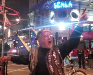 But can I point out that the guy in the great pictures above is not actually a local (much as I’m sure we’d all welcome him in Kings Cross). That’s Des from Kingston, famous as one of the fairly regular participants in the monthly London Critical Mass bike rides, always with his bike with the famous Heath Robinson contraption on top, and his almost-a-trumpet. For those who don’t know, the London CM rides have taken place _every_ month now for more than 15 years, always meeting under the south end of Waterloo Bridge by the NFT bar at 6pm-6.30pm. By 7pm, hundreds (usually) of cyclists then take to the streets together, going whither the mood takes them (or the people at the front fancy), and for a while the traffic is driven off some of the roads of central London by sheer force of numbers of the bikes. It’s exhilarating – first-timers are always made welcome….