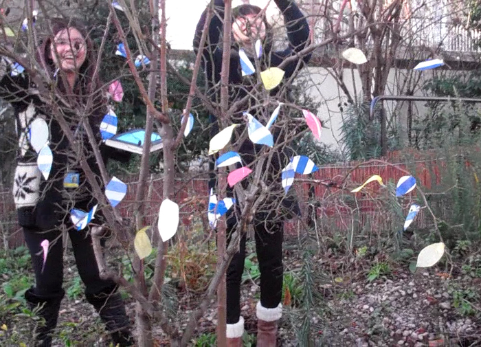 Ok, so it doesn’t actually sing, or ring (she says showing her age – see below). But it does raise awareness about recycling plastic. It’s a lovely little tree at Thornhill Bridge Community Garden, on the western side of the canal bridge over The Cally, and it’s been decorated on this stark winter’s day with beautiful imitation leaves that glint as the sun catches them.