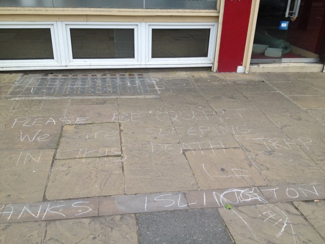 ‘Please be quiet we are sleeping in this death trap. Thanks Islington’