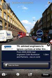 For the deeply tech-y Talk About Local are experimenting with AR technologies. They have built a web service which takes RSS feeds containing geo-tags (GEO-RSS feeds) and publishes them in Layar’s AR environment. The feeds then auto-update into the AR environment, providing a copy, paste, forget service to site owners. Posts in the AR world all click through to the original source page and provide a ‘take me there’ map feature. This makes it much, much easier to get stuff into a mobile AR environment. Read the kick off post for the project and see the project updates.