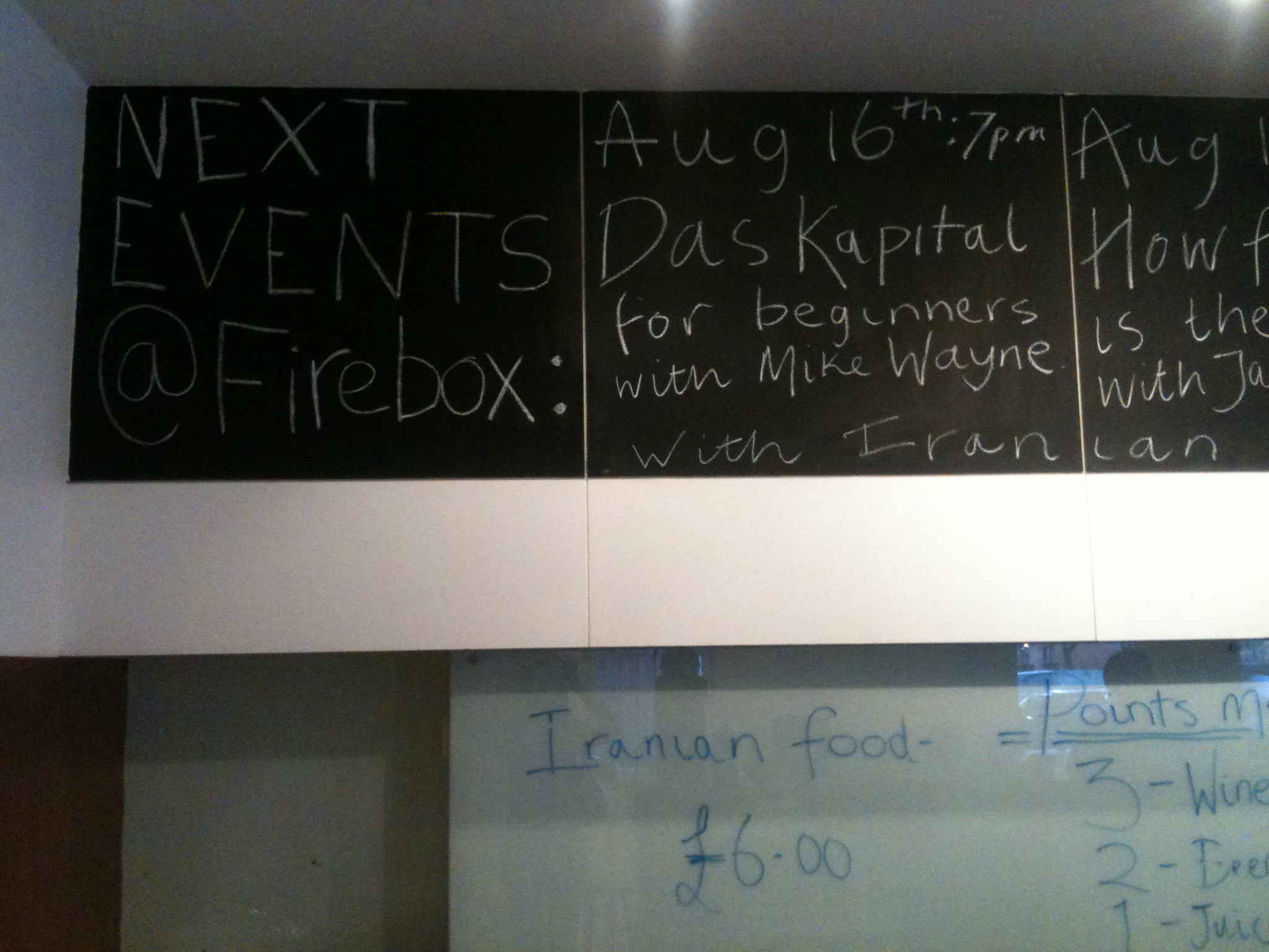 The neighbourhood may well be cementing – or re-cementing – its status as a leftie hotbed lately with the opening of Firebox, an events space and café run by Counterfire, who describe themselves as a group of revolutionary socialists.