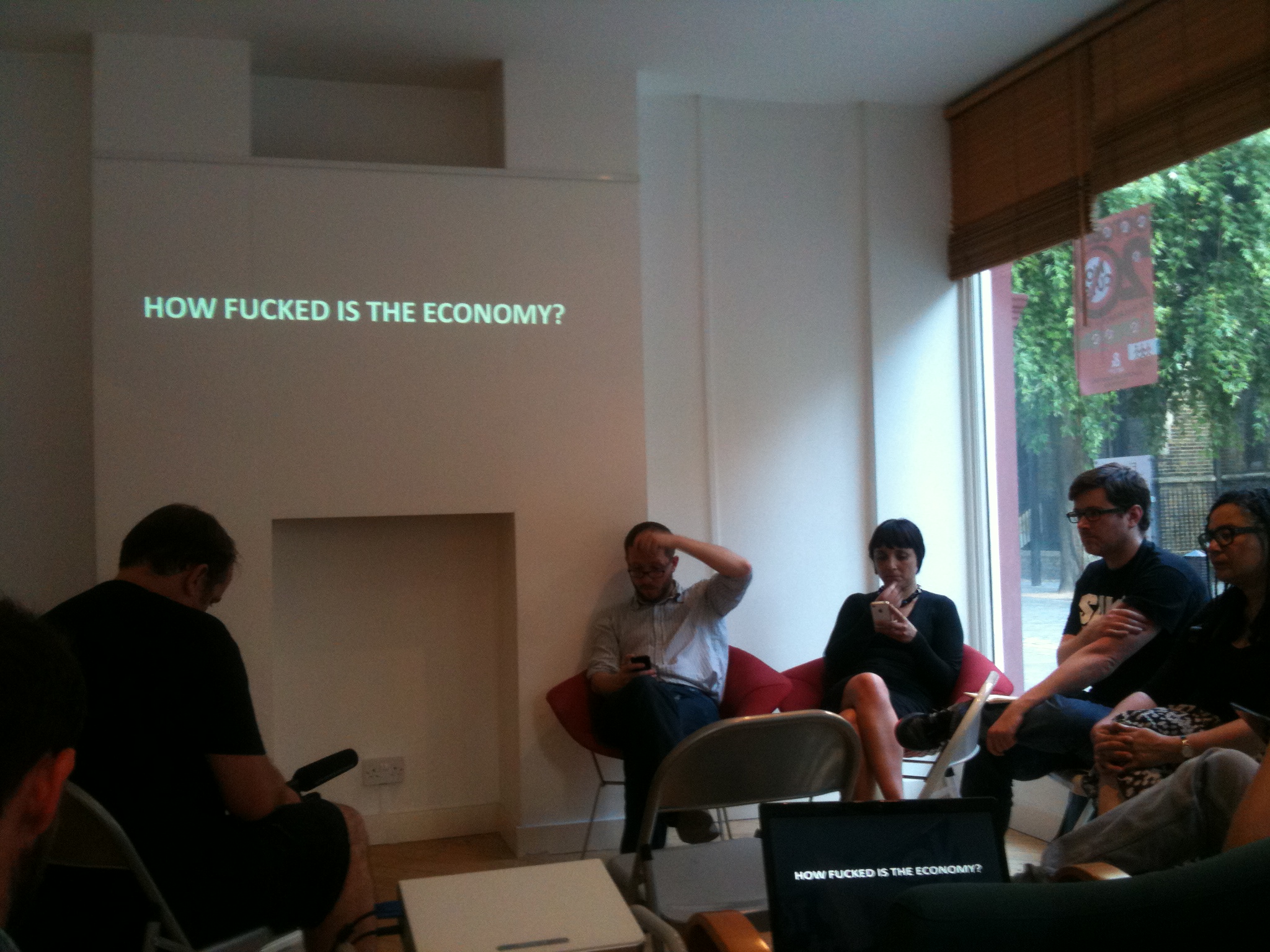 I checked out the irresistibly entitled “How fucked is the economy?” talk a couple of Fridays ago at Firebox. A fiver got me in the door and a glass of wine, although at first there was some confusion at both the door, and the charmingly battered copper (no word play intended, honestly) bar as to whether I was to get one or not, and how much extra it was for the tempting Iranian food.