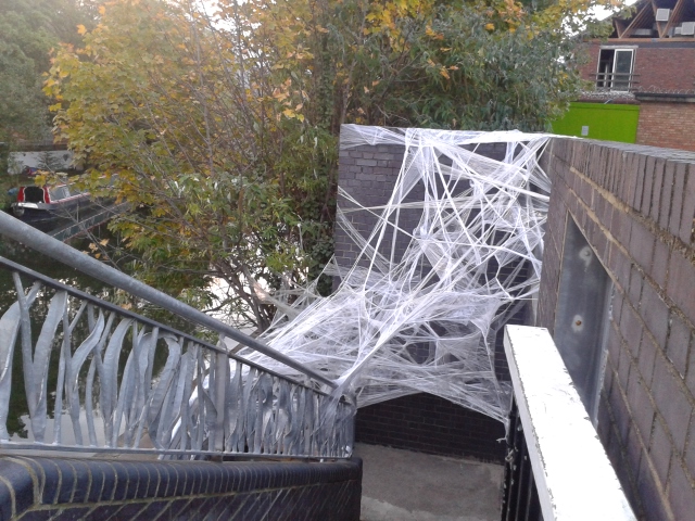 As I walked my foster dog Lad from east to west on Regent’s Canal, we came off at Camley Street to take in the autumn loveliness of old St Pancras Cemetery. Turning towards the bridge we were faced with a silvery web surrounding pockets of space. Climbing up the steps we walked through the installation and met the students at the top.