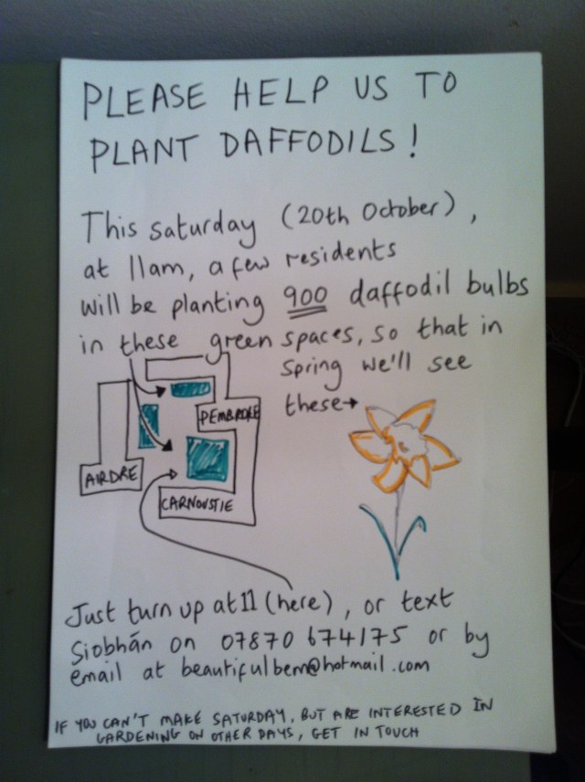 The bags were printed in a living room and sold to raise money for daffodil bulbs to plant in the grounds of the Bemerton Estate. If you live on the Bem and would like to join in planting them, get in touch at BeautifulBem@hotmail.com. Or if you’re a local gardener and want to offer help or plants/cuttings to fill empty flowerbeds, get in touch!