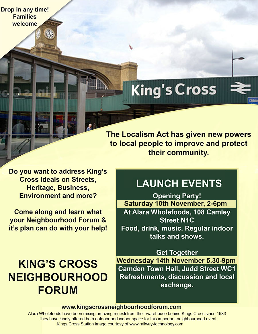 The Neighbourhood Forum for King’s Cross invites the local community to its launch event on Saturday 10 November at the muesli factory, Alara, in Camley Street. It runs from 2-6pm and there will be entertainment and refreshments.