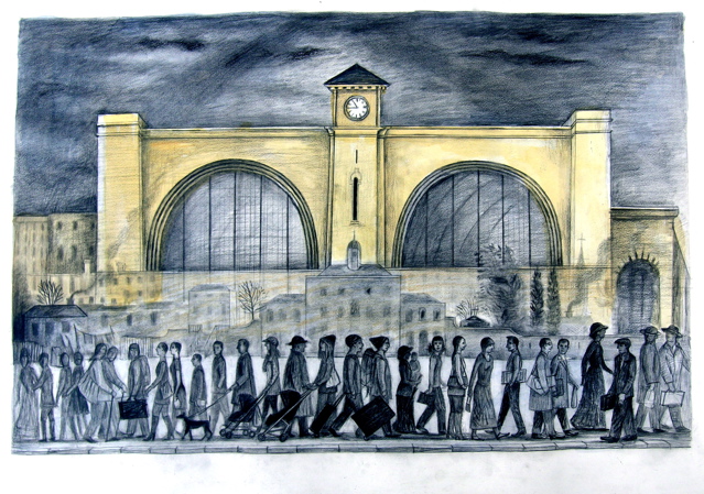 It’s from a recent project: ‘The present in the Past’ (not exhibited yet) appropriating and responding to archive prints of the area. The Small Pox hospital stood near the footprint of King’s Cross, it was pulled down to make way for the building of the new station. The drawing shows people walking across the station square over the years, with the ghost of the hospital in the background.