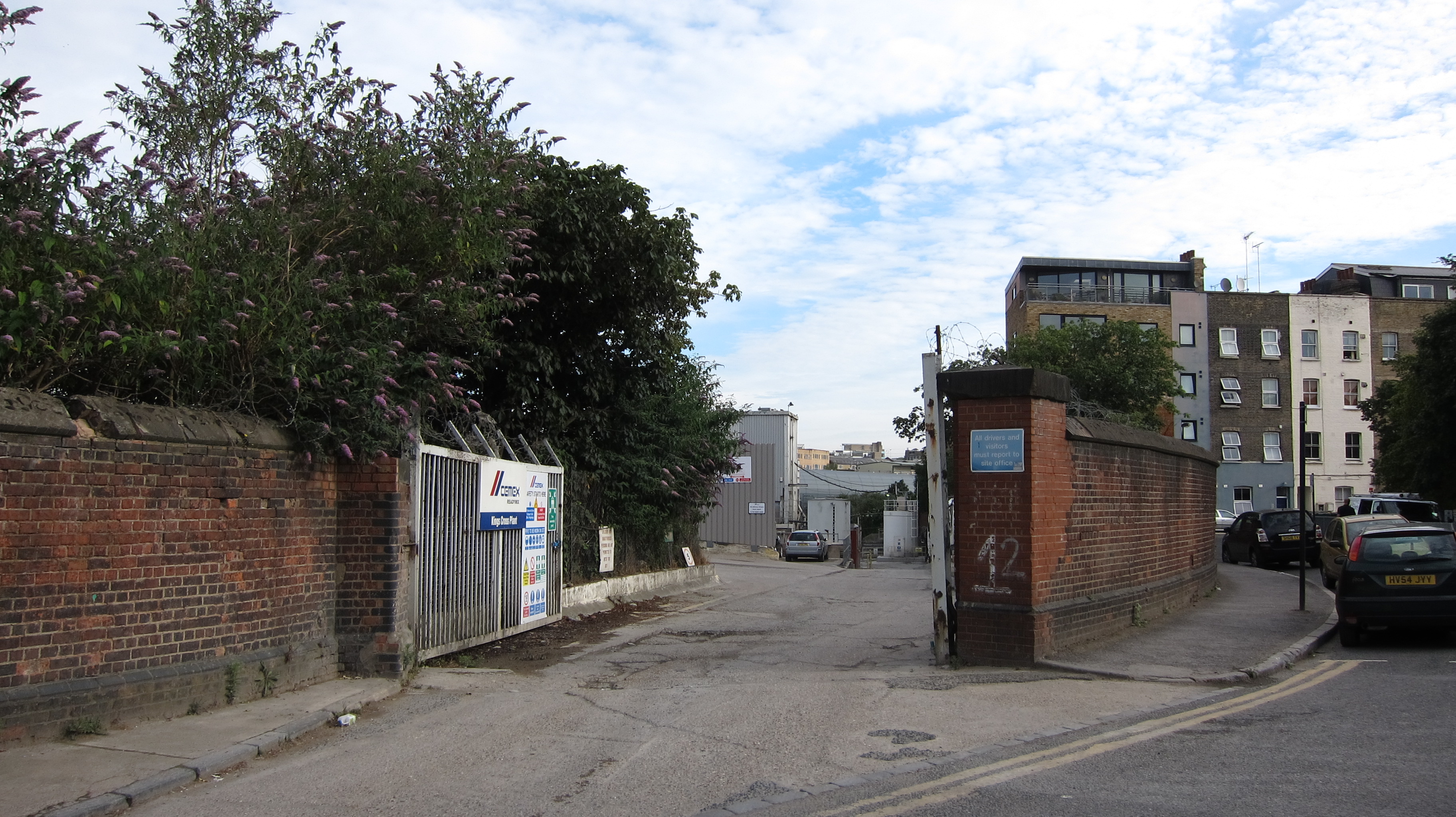 Cemex have a concrete plant next to Rufford Street, they bought it from Readymix. It’s a legacy of the old Kings Cross when people just thought they could dump noisy bits of industry here because no one cared. The plant was built in the early 1960s on the site of an old, architecturally distinctive mortuary of which only the forbidding wall survives. At the planning inquiry the inspector said that he thought it didn’t matter that the plant was noisy as the steam trains would drown it out (seriously) and was backed up on appeal by the Minister. As the picture shows the plant is cheek-by-jowl with houses.