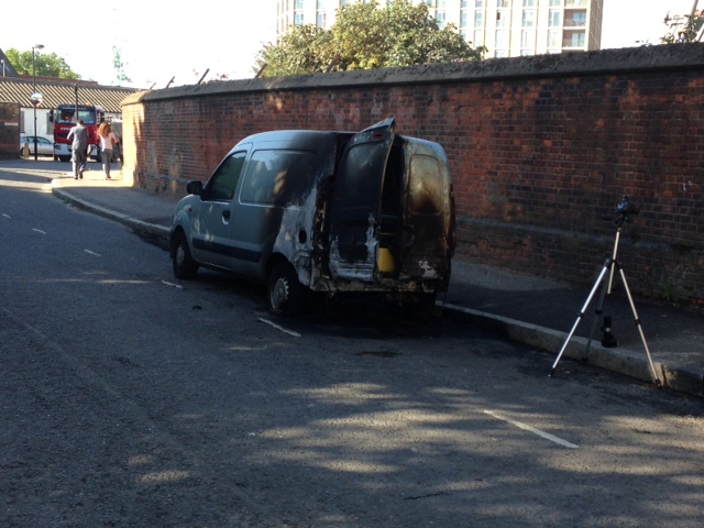 Things are going on fire in Rufford Street again, at about 0500 this morning – resident Stuart has sent in some pics. It’s a bit early in the morning for the traditional arsonists so we’ll have to wait and see what the cause is – police forensics are on the scene. Appears to be a rail contractor’s van so it could be some badly stored chemicals getting a bit frisky.