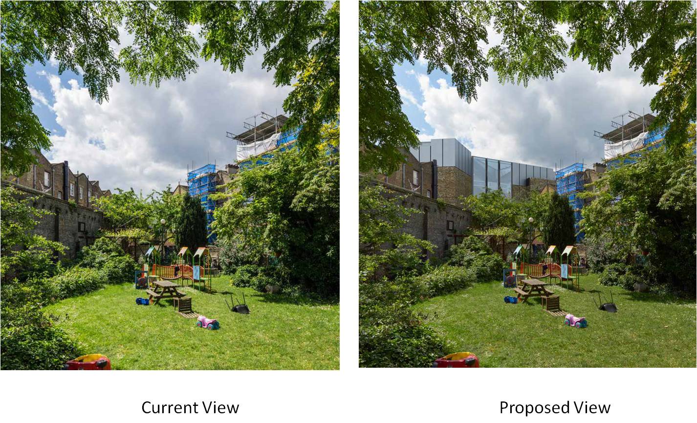 I live directly behind/under/boxed in by the proposed building, so this will certainly block our light and ability to enjoy our property. The drawing here is clear on that, even though they have dramatically stretched the perspective so the building feels further from the garden than it will be in real life. The fact remains that they are taking a two-storey brick facade and whacking two more great storeys of steel and glass on top of it – and suddenly we all live in Canary Wharf.