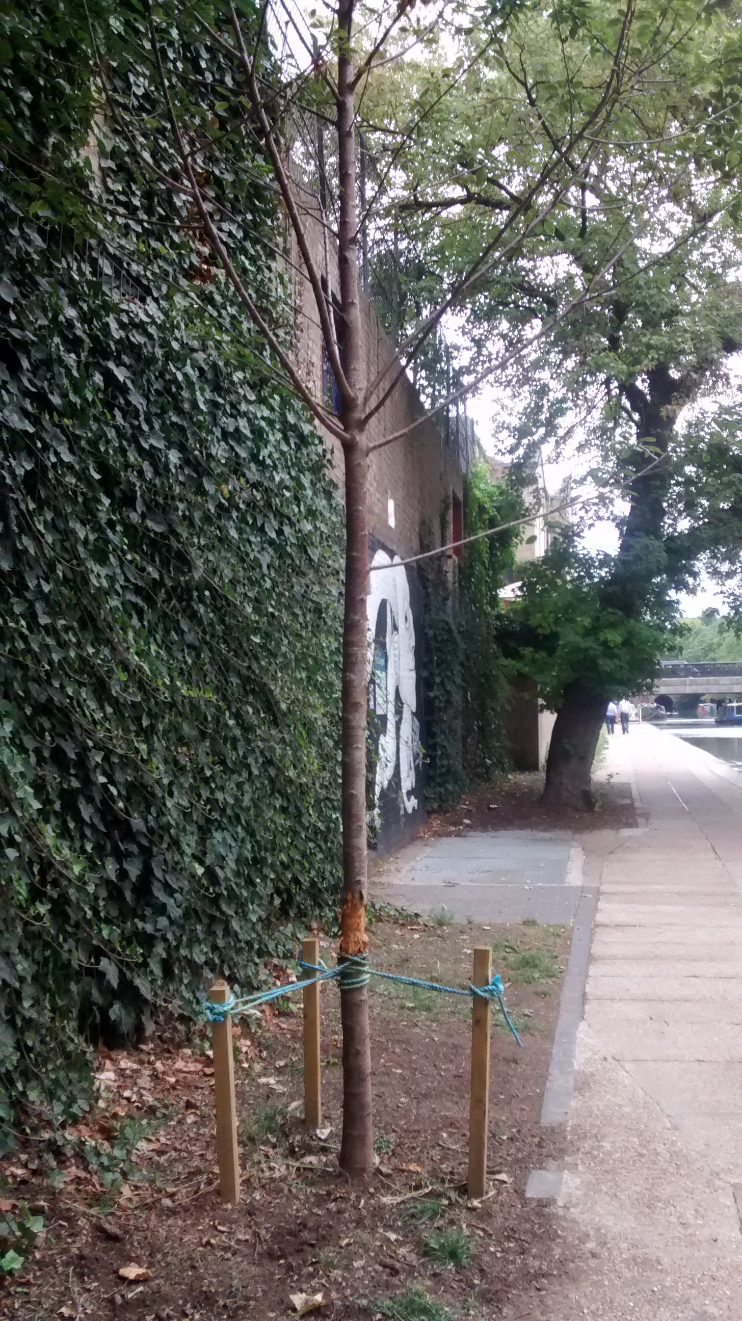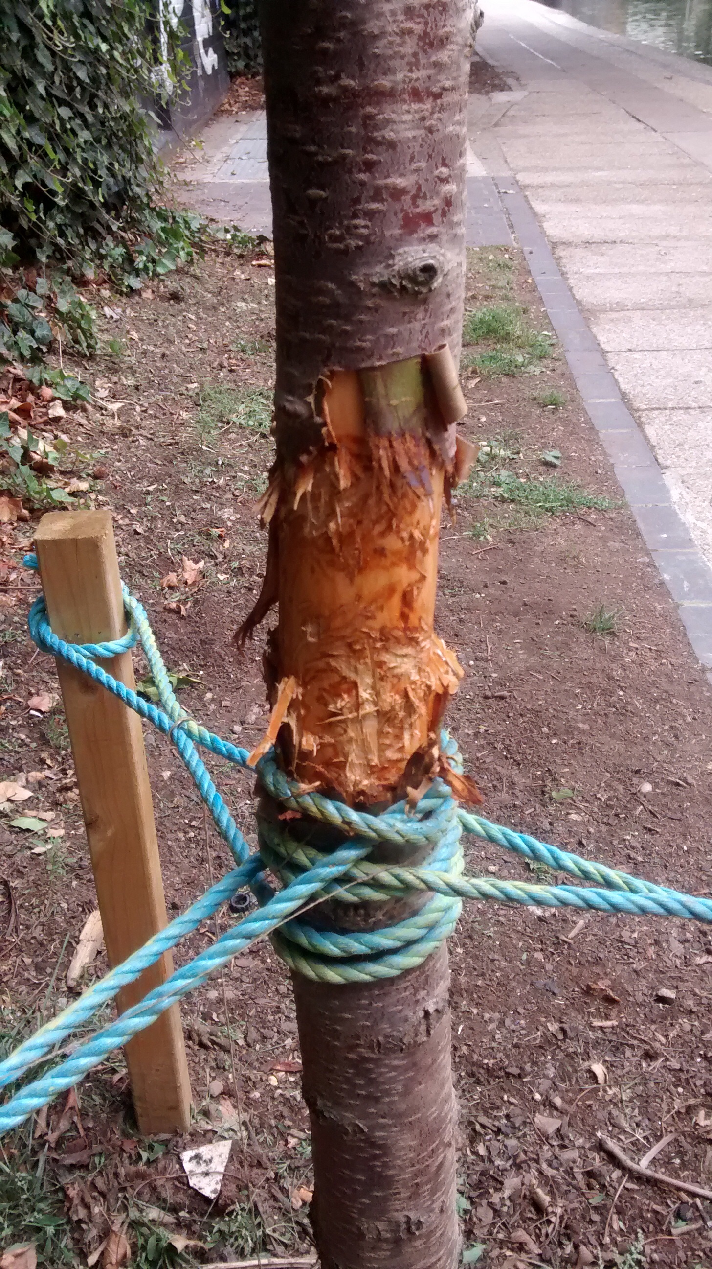 Last year two trees were killed on the Regent’s Canal towpath by vandals. The first at Thornhill Bridge Community Gardens and the second behind Copenhagen School. The Copenhagen School tree was replaced in May by a semi mature cherry tree that would have been filled with blossom next spring. On Friday or early Saturday last week the tree was left to slowly die after the bark on its trunk was ringed.