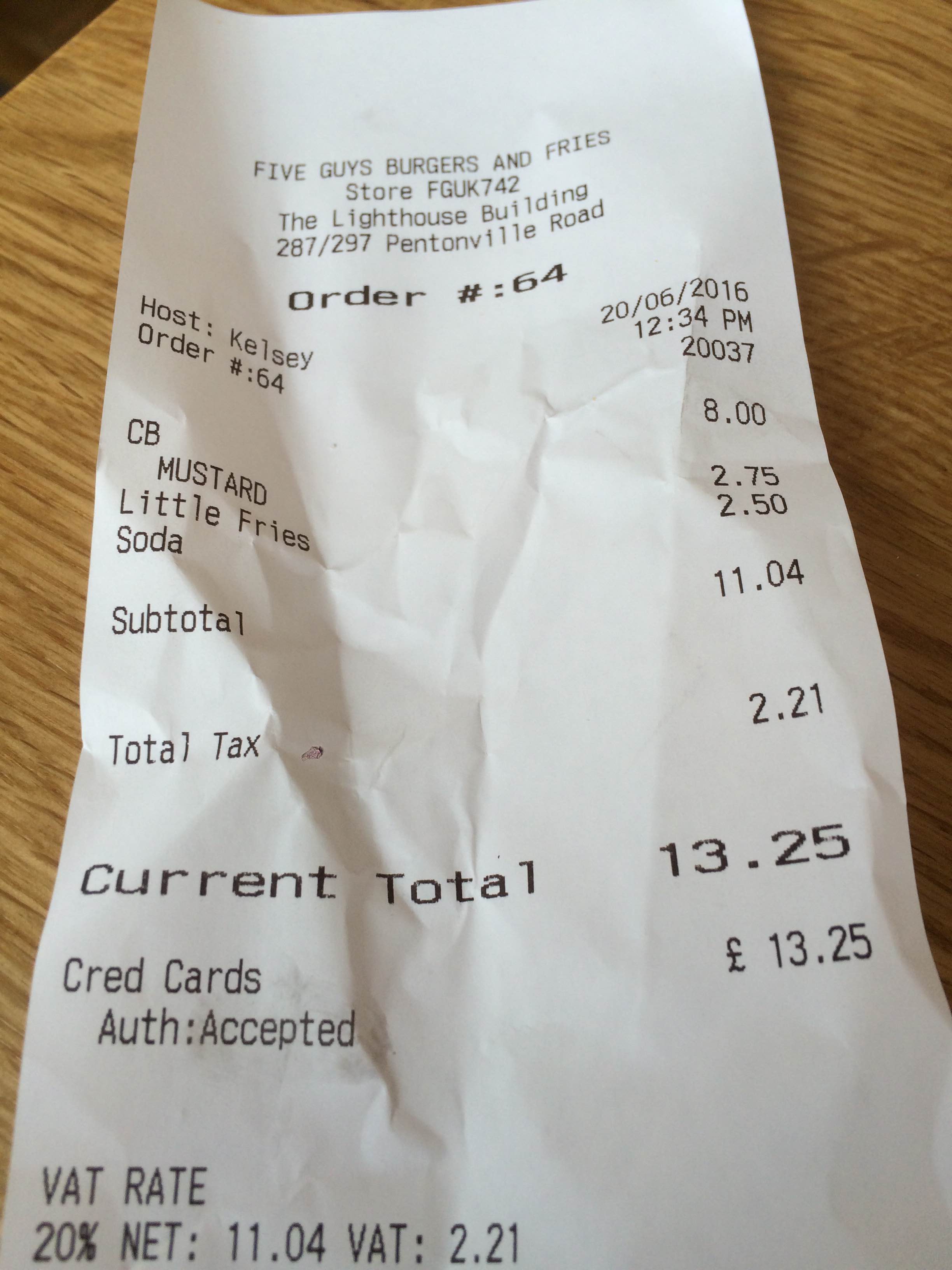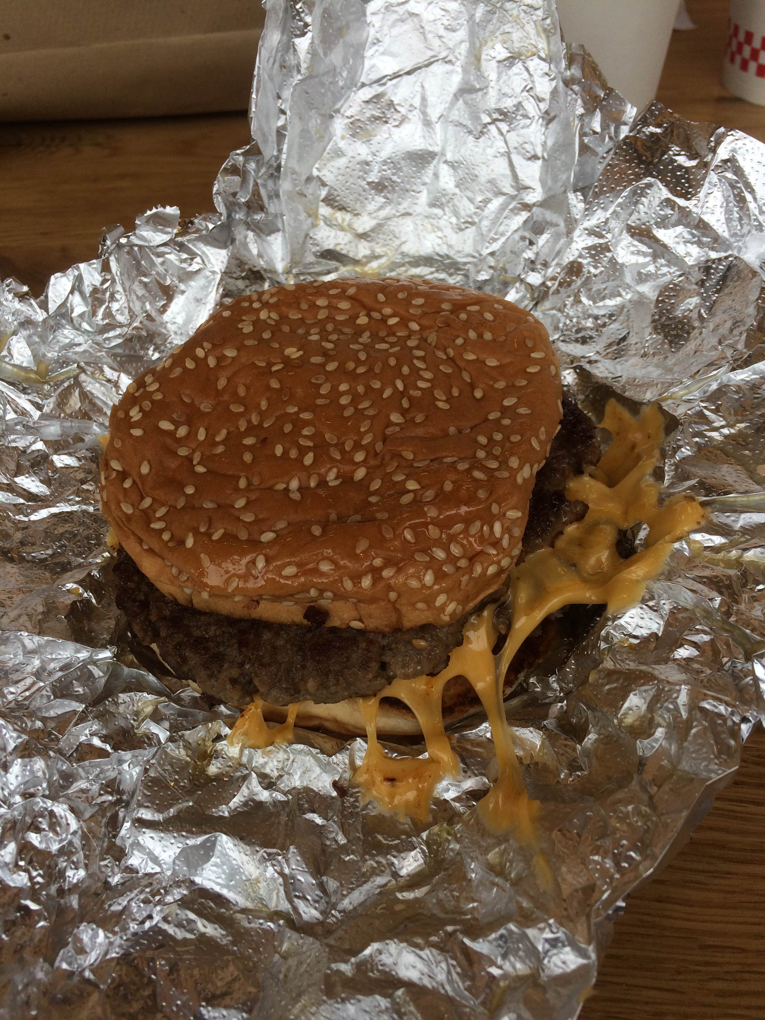 My first time in a Five guys and I ate a cheeseburger, fries and diet coke which came to a substantial £13.25. The two-pattie burger was very good though not exceptional, the cheese was better than average, the bun ok. The diet coke was admix self service.