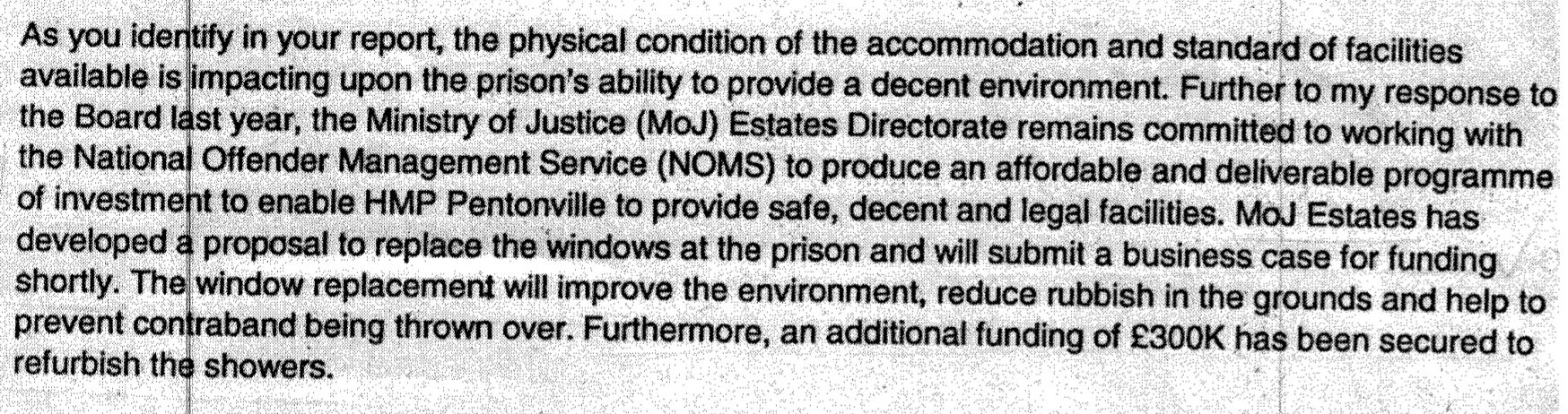 The Chair of the Independent Monitoring Board in a letter of 10 November 2016 also released under FOI is clearly frustrated that the Secretary of State and her team at MOJ haven’t seized the issues with any sense of urgency.