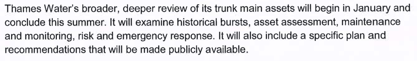 Thames Water is producing its own broader review of trunk mains that will report ‘this summer’ with an action plan, according to the then Secretary of State.