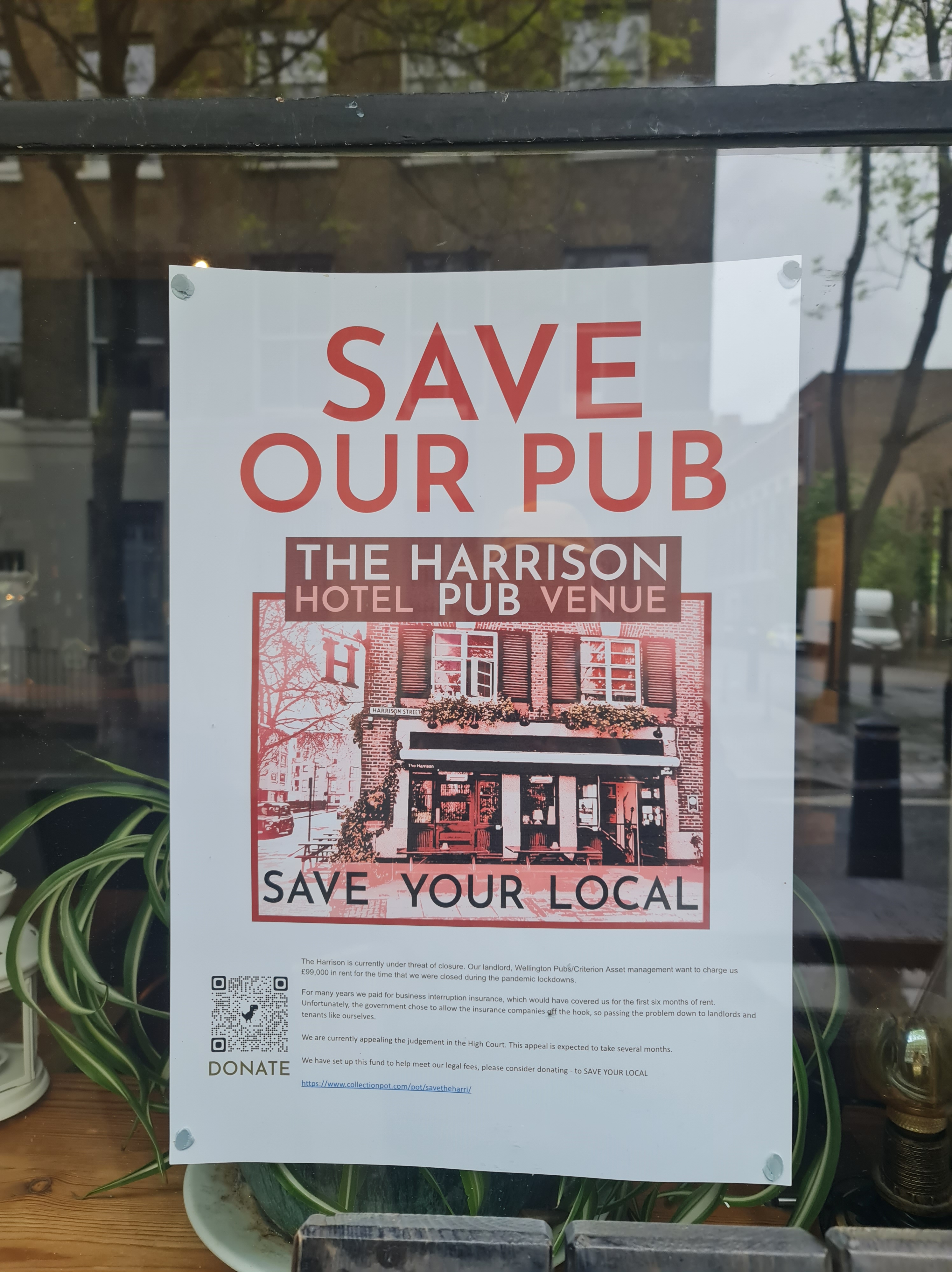 We are told that the pub is to serve a rental-bill of 99.000 Pounds to pay back lost rental income from the pandemic period. As a first step, there is an attempt to appeal the court judgement for which The Harrison would like to raise money to cover the 15-30.000 Pounds of legal fees.